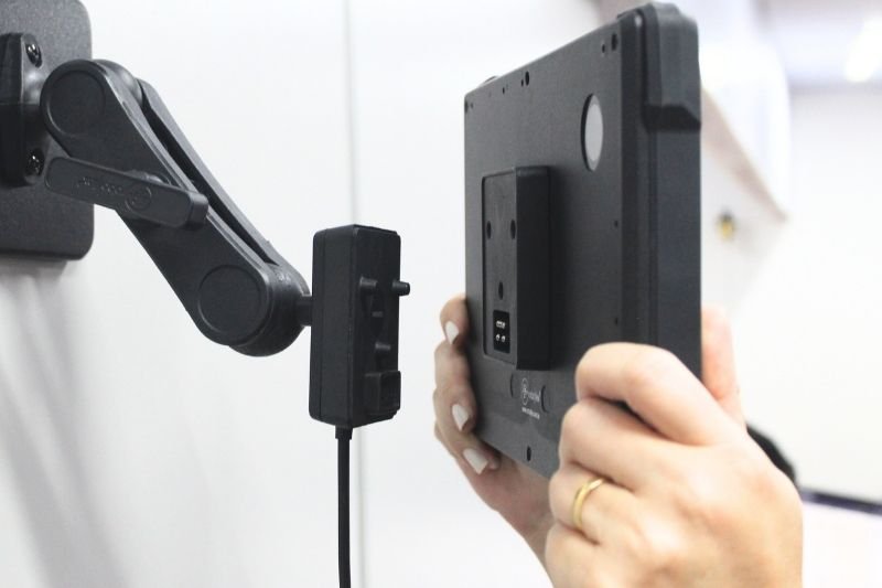 Em campo, mobilidade não significa apenas deslocamento, significa acesso contínuo à informação. Quando o dispositivo é integrado a suportes e alças adequadas ele acompanha o operador sem comprometer ergonomia ou segurança.